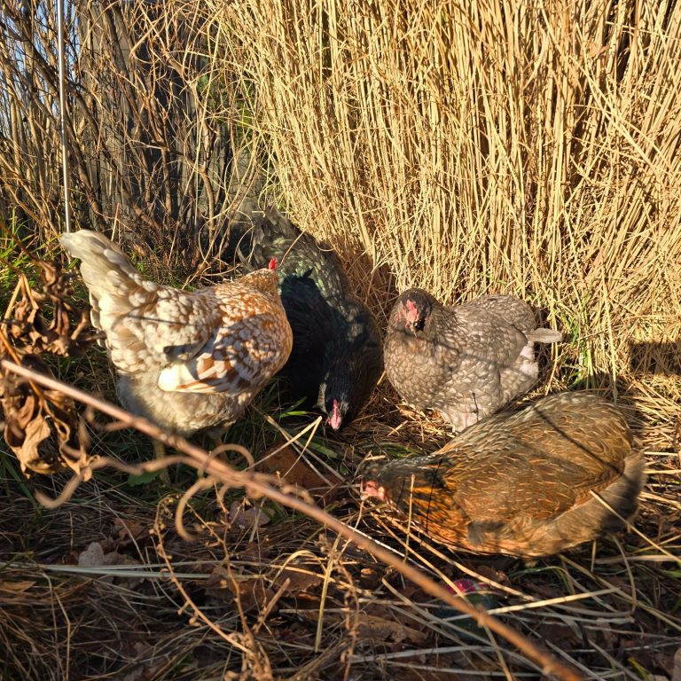 4 Handzahme Damen, die tiefenentspannt mit Hunden und Kindern durch den Garten spazieren und ihre Miete ganz charmant mit frischen Eiern begleichen.
